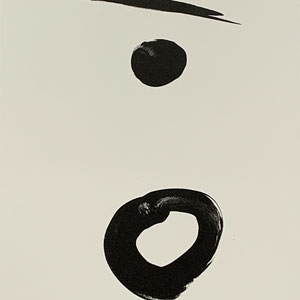 scheinbar hastige Spritzer oder Lavierungen in verschiedenen Tönungen, entstehen Variationen unterschiedlich breiter Pinselstriche von explosiver Farbkraft. In der Sparsamkeit der Mittel und der