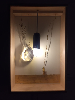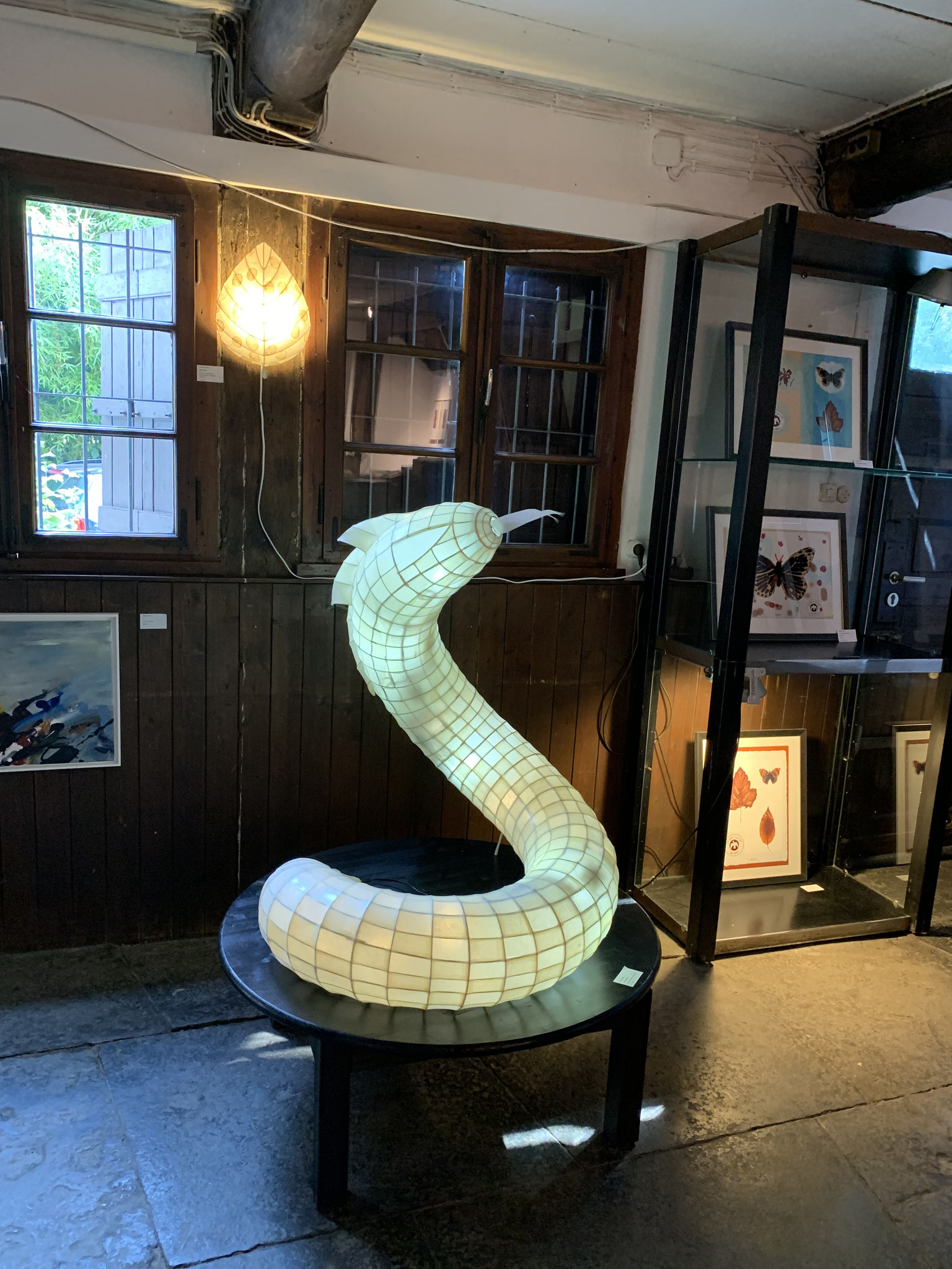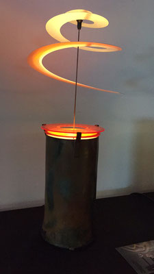 Christiane Kling kombiniert Alltagsgegenstände bzw. z.B. Umverpackungen mit Licht und entwickelt daraus völlig interessante neue eigenständige Objekte, die sie vortrefflicherweise RecyKlings nennt. Ihre filigranen Mobiles, Fire and Water mit eigens hergestelltem Keramikfuß, beginnen ihre Rotation, sobald die Luft durch das warm werdende Leuchtmittel nach oben strömt. · Dasselbe Prinzip wird bei Kundalini sichtbar. Aus dem Sanskrit für Schlange, „Schlangenkraft“ bezeichnet eine in tantrischen Schriften beschriebene ätherische Kraft im Menschen. Der Glasaufbau ist in Hand- bzw. Mundarbeit entstanden, die Künstlerin konnte in der Glasbläserei dem Entstehungsprozess beiwohnen.