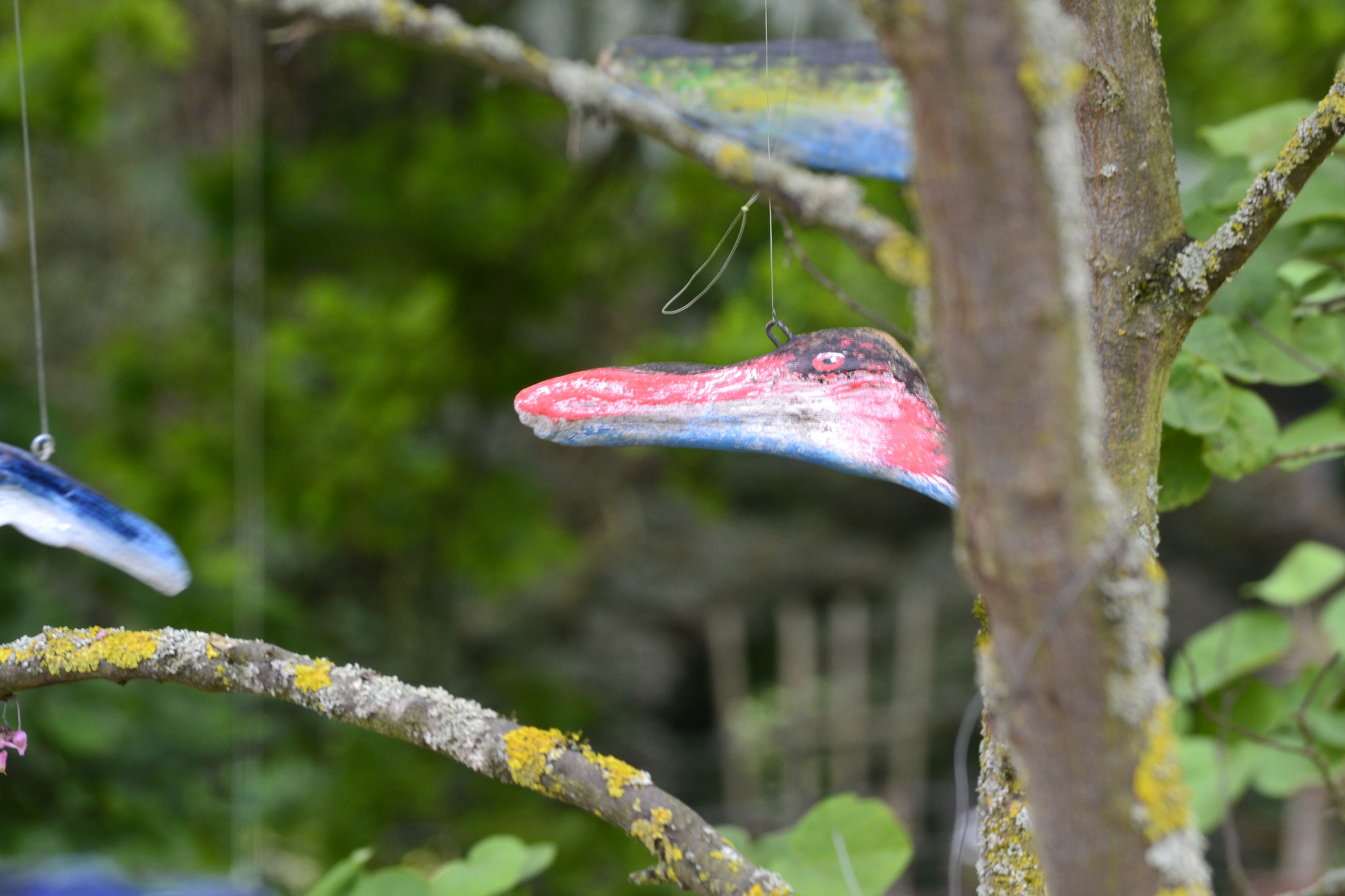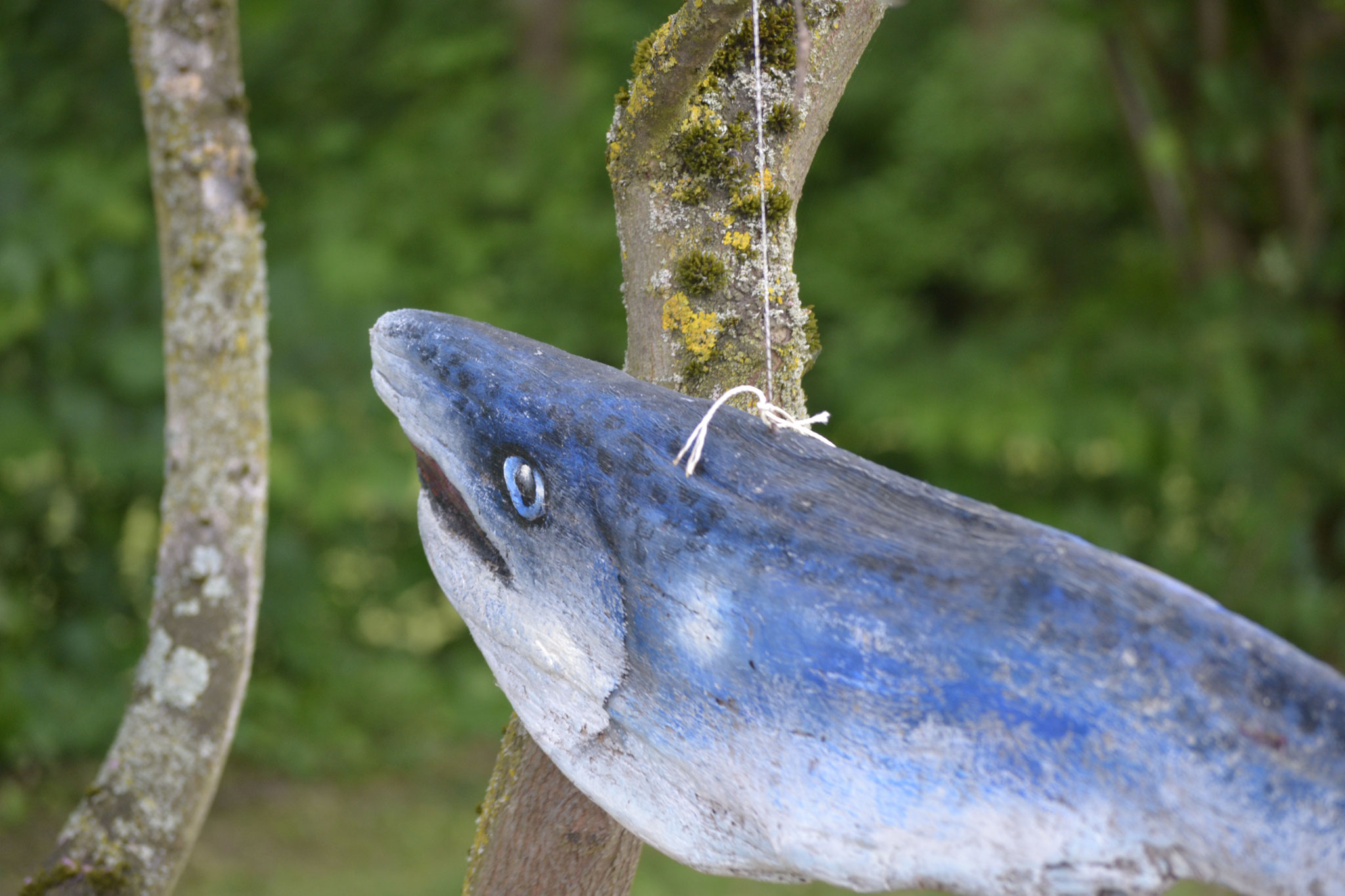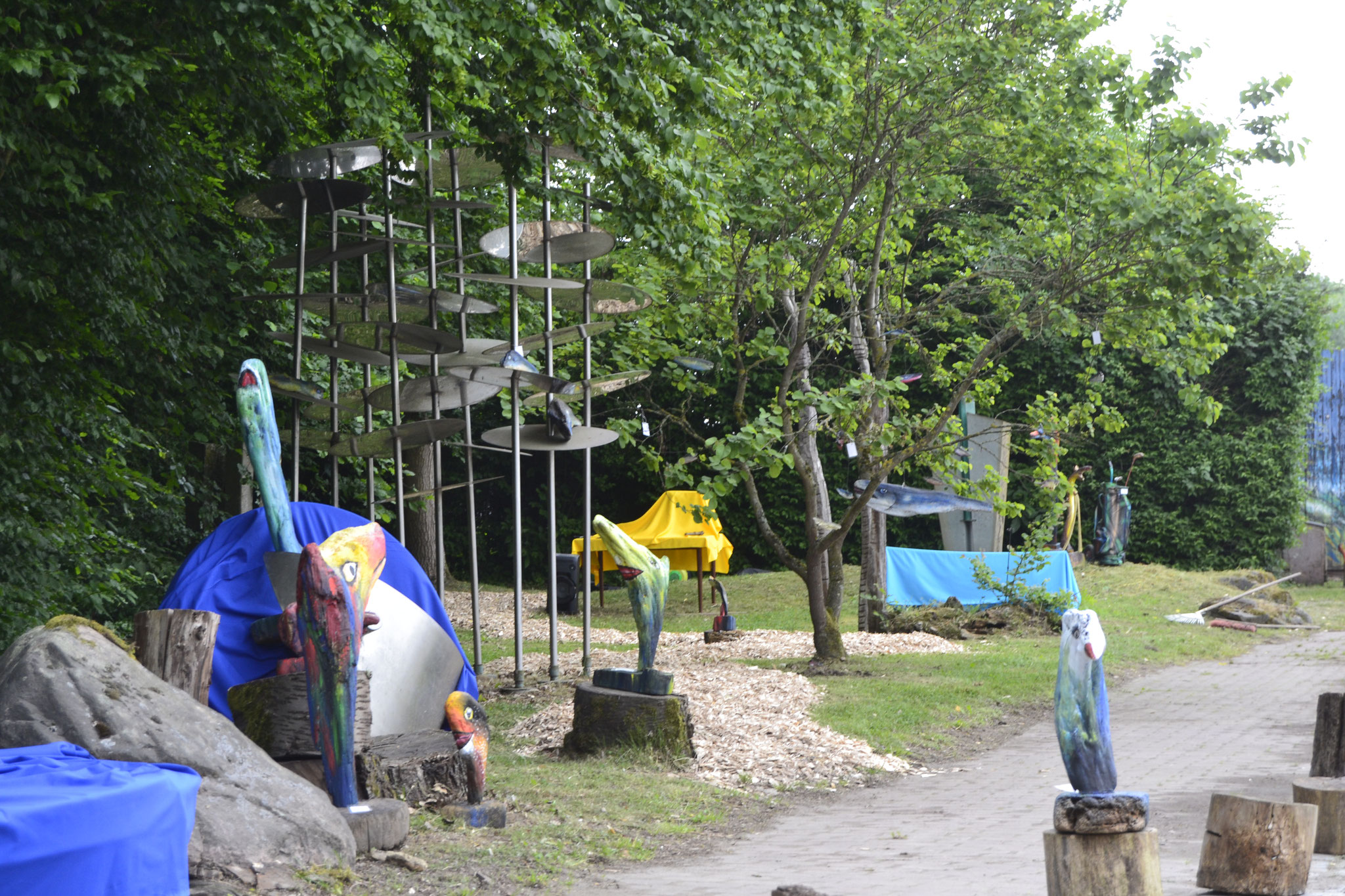 Die Gevelsbergerin Brigitte Riechelmann nähert sich der wichtigen Ressource Holz eher zwanglos, frei nach Picasso sucht sie nicht, sie findet. So bleibt in ihrer Installation „Ypsilonten“ die natürliche Form des Holzes erhalten. Hier ist es die Komposition der einzelnen Elemente, die in ihrer Gesamtheit ein besonderes Motiv offenbaren. Diese Art von Installationen im „Naturraum“ bzw. das Wechselspiel und die Symbiose von Kunstwerk und öffentlich-natürlichem Raum sind charakteristische Merkmale der sogenannten „Land-Art“. Landschaftskunst in abstrahierender Weise zeigen Riechelmanns kleine Malereien auf Holztäfelchen auf eigens gefertigten Ast-Staffeleien, und der Materialmix ihrer kleinen Skulpturen spiegelt ihre Neugier und Kombinationsfreude natürlicher Gegenstände wider, die Titel weisen auf Fernweh, Abenteuerlust und Entdeckerdrang hin.