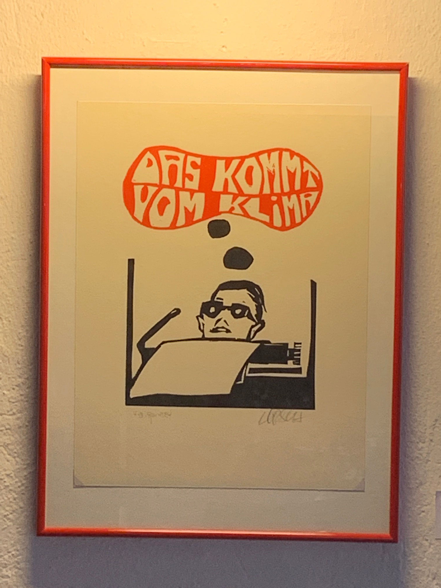 Bei dem Bochumer Künstler H. D. Gölzenleuchter wurde es dann grober. So erschuf er eine seiner „Druckplatten“ aus Holz für seine Holzschnitte. Sowohl Platte als auch Holzschnitt präsentiert der Künstler gerne als Unikat.