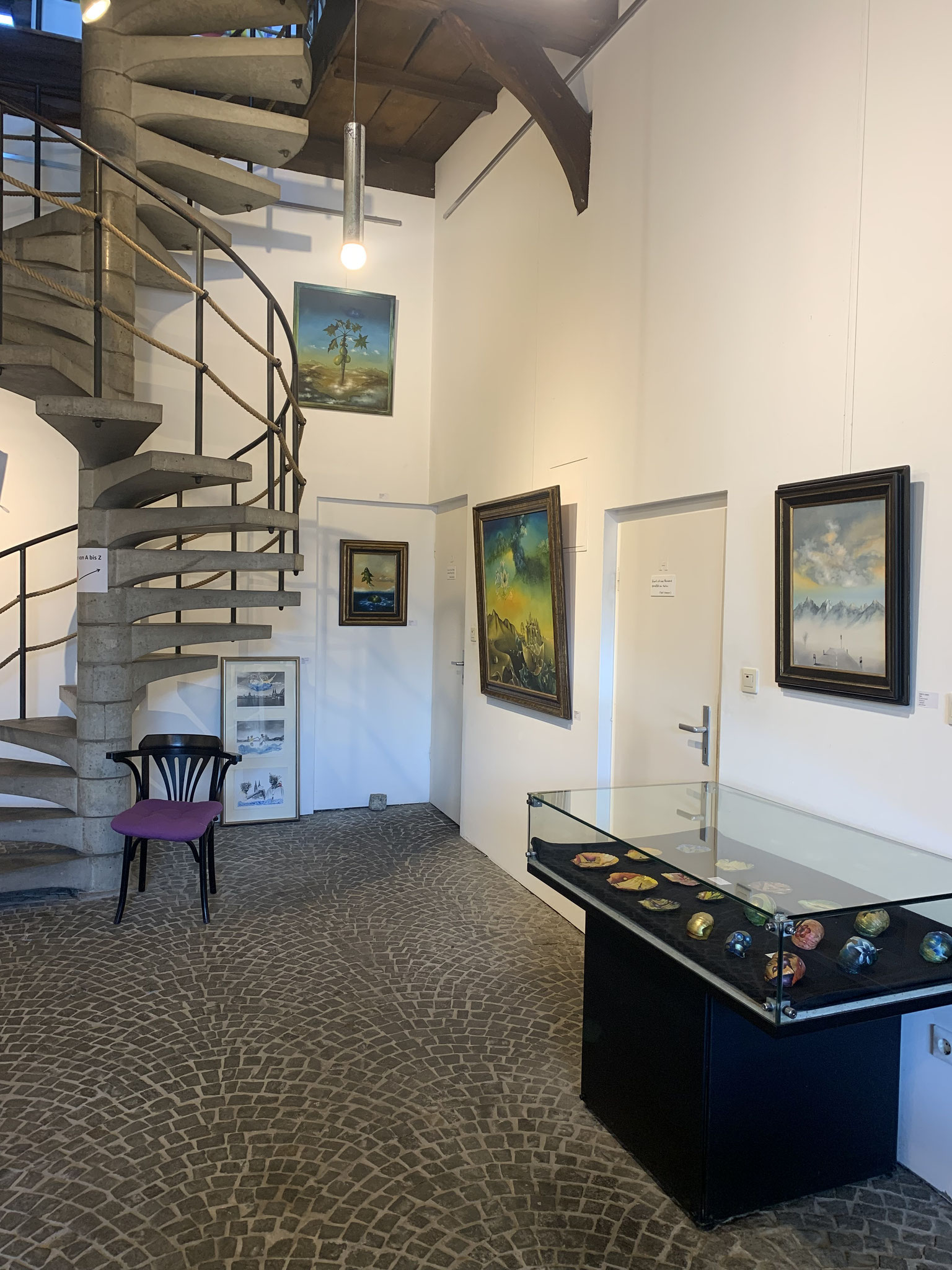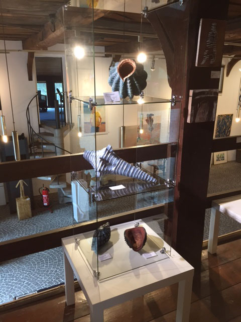 Im gesamten Ausstellungsraum unseres Erdgeschosses können weiterhin die fein gearbeiteten Drechsel-Arbeiten der Künstler Holger Hinrichs und Hartmut Lobert bestaunt werden. Wunderbare Holzobjekte aus Eiche, Ulme, Olive und vielen anderen Hölzern sind zu Schalen, Gefäßen und Objekten gearbeitet worden. Die Verarbeitung und der Umgang mit dem organischen Material zeigt die Erfahrung und Kenntnis der Künstler, um die Schönheit dieser Naturprodukte auch dauerhaft zu erhalten. Berühren und anfassen erlaubt. Ein Highlight sind die ungewöhnlichen Objekte aus dem Meer von Christine Wenzhöfer, einer besonderen Drechslerin, die eine ebenso besondere Technik für sich erarbeitet hat. In einer Kombination aus Drechseln, Fräsen, Sandstrahlen und Colorierung zeigt die Künstlerin fein gearbeitete Muscheln aus Mammutbaum, deren Titel auch Raum für die eigene Phantasie lassen.