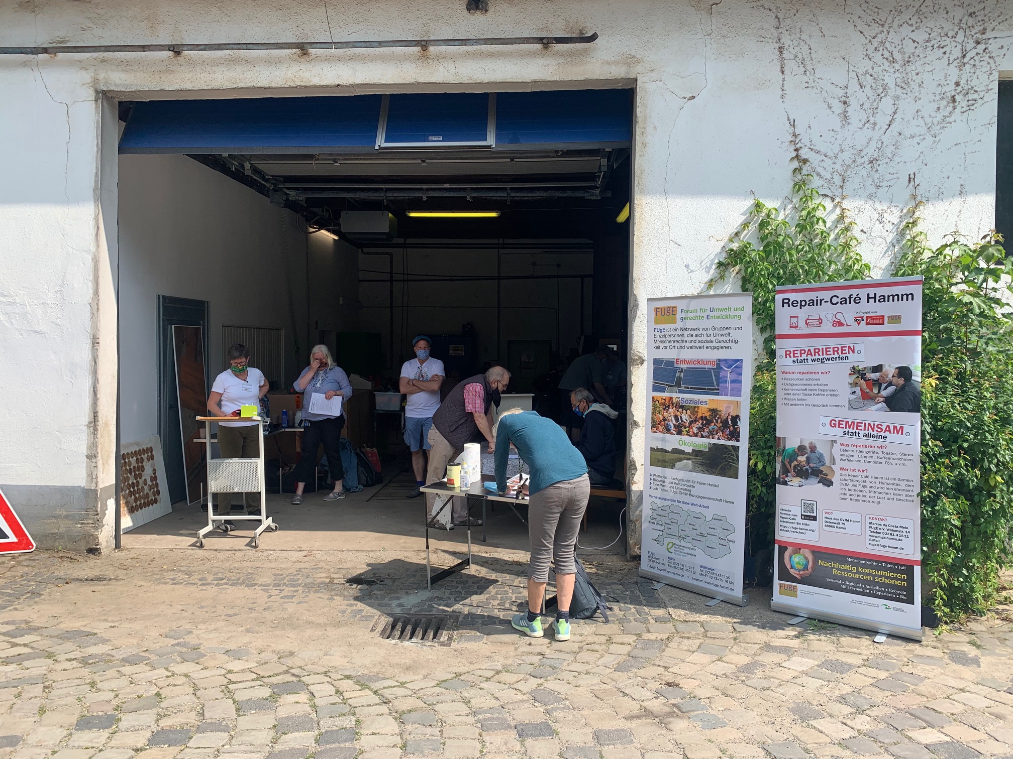 Am Samstag, den 20.06.2020, hatte sich auf unsere Einladung hin das Team von Ehrenamtlichen Reparateuren des Hammer Repaircafés bereit erklärt, im Rahmen unserer Ausstellung erstmals seit Corona wieder aktiv zu werden. Dafür sagen wir herzlichen Dank auch an die Unterstützenden im Hintergrund des Hammer Forums für Umwelt und gerechte Entwicklung (FUgE). In der Werkstatt der Firma Kley wurden defekte Elektrogeräte repariert. Mit gebührendem Abstand zu den Reparateuren und ihren Klienten konnten sich die Besucher anschauen, was alles bald wieder funktioniert, wenn man ein loses Kabel geflickt oder einen Stecker ausgetauscht hat. Manchmal war es auch kniffeliger, aber die Reparateure gaben so schnell nicht auf, ihre Erfolgsquote liegt immerhin bei rund 70 %. Das Repaircafé findet sonst im Haus des CVJM statt und zwar jeden 3. Samstag im Monat von 10.00 bis 13.00 Uhr.