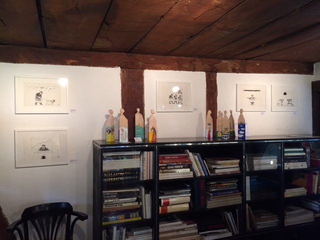 Humorvoll, überspitzt und zuweilen etwas bissig präsentiert Günter Rückert Skurriles aus dem Alltag. Auch die Bildtitel seiner Kunstwerke sind nicht immer ganz ernst zu nehmen. Rückert sucht bewusst nach provozierenden Titeln, mit denen er die Situationen auf seinen Bildern zu verstärken versucht. Diese Skurrilitäten sind in unserer Ausstellung nicht nur auf besagten Skulpturen des Gemeinschaftsprojektes von Günter Rückert und Bernd Moenikes zu begutachten, sondern auch auf kleinen bemalten Holztäfelchen sowie in seinen Holzkopp-Zeichnungen.