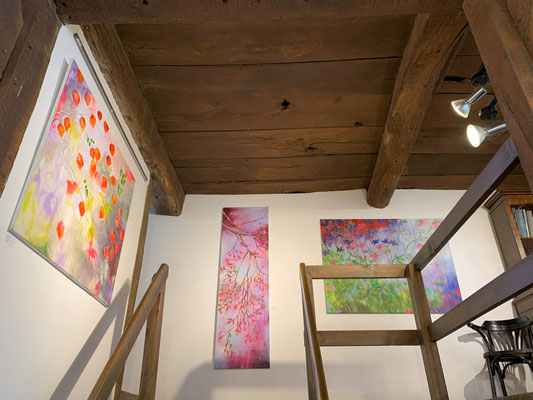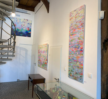 Manches Bild entsteht auch nicht in einem Rutsch, sondern wird weggestellt, vielleicht sogar, weil es noch unklare Emotionen hervorruft, und dann steht das Bild mitunter wochenlang, bis die Künstlerin wieder daran weiterarbeitet.